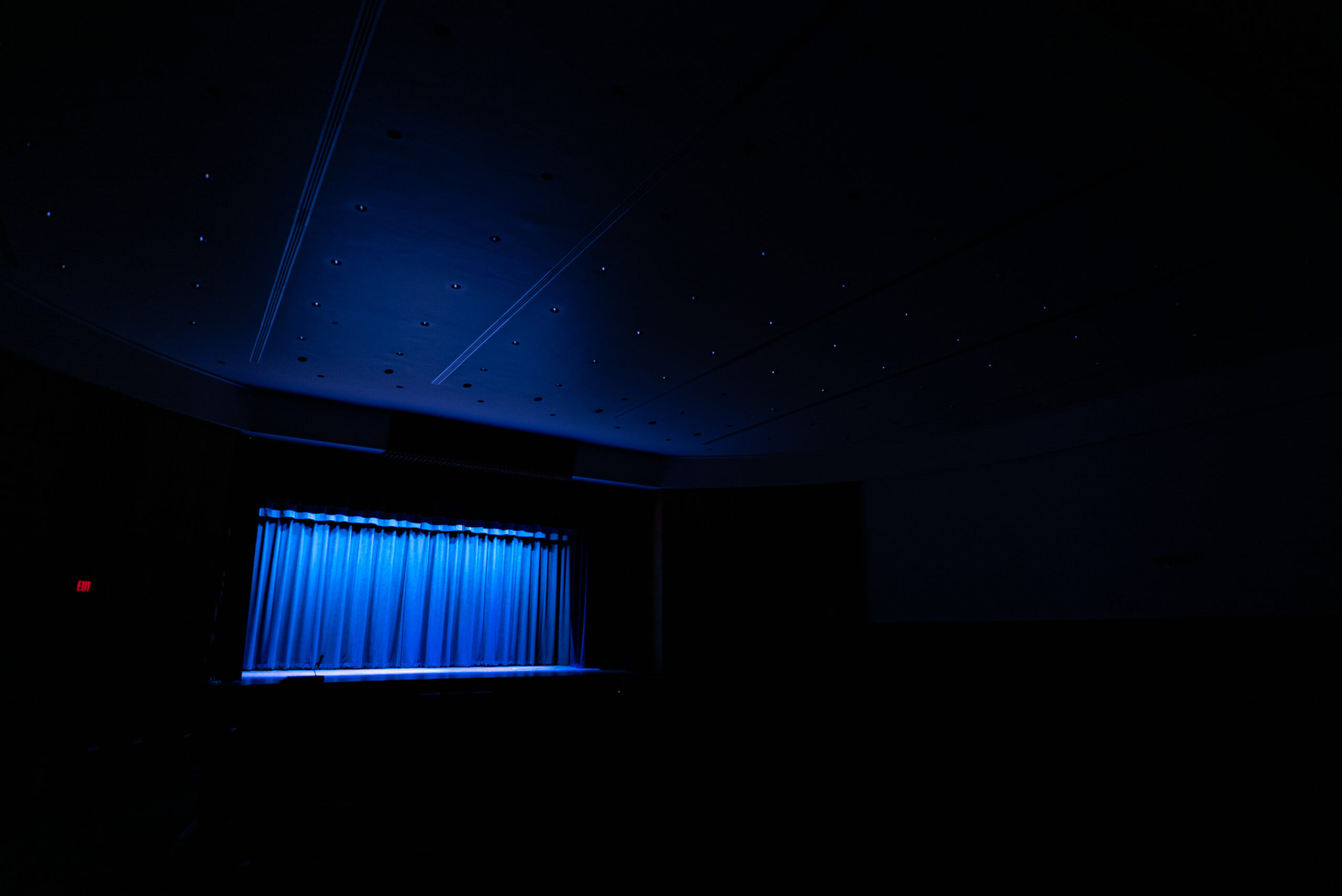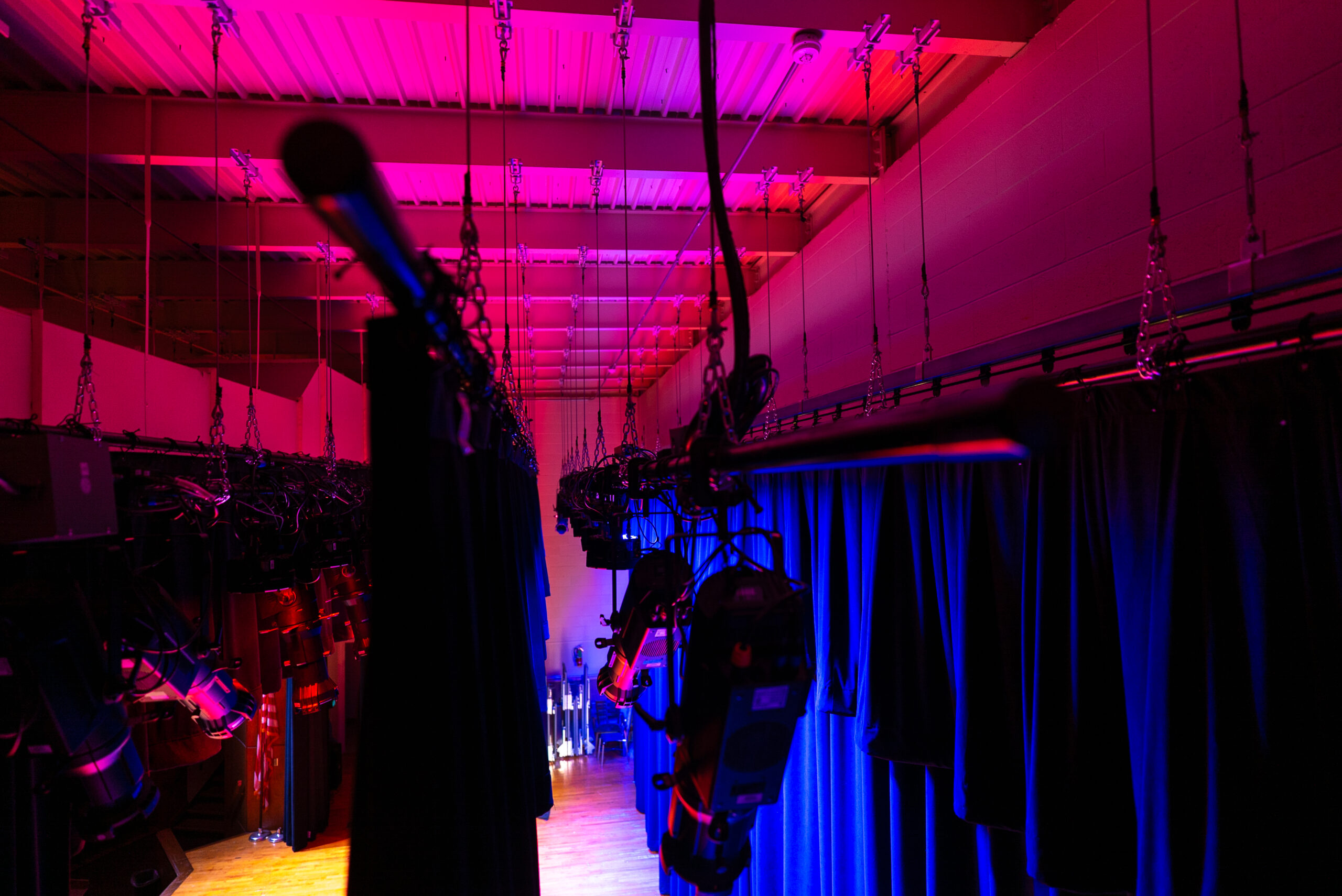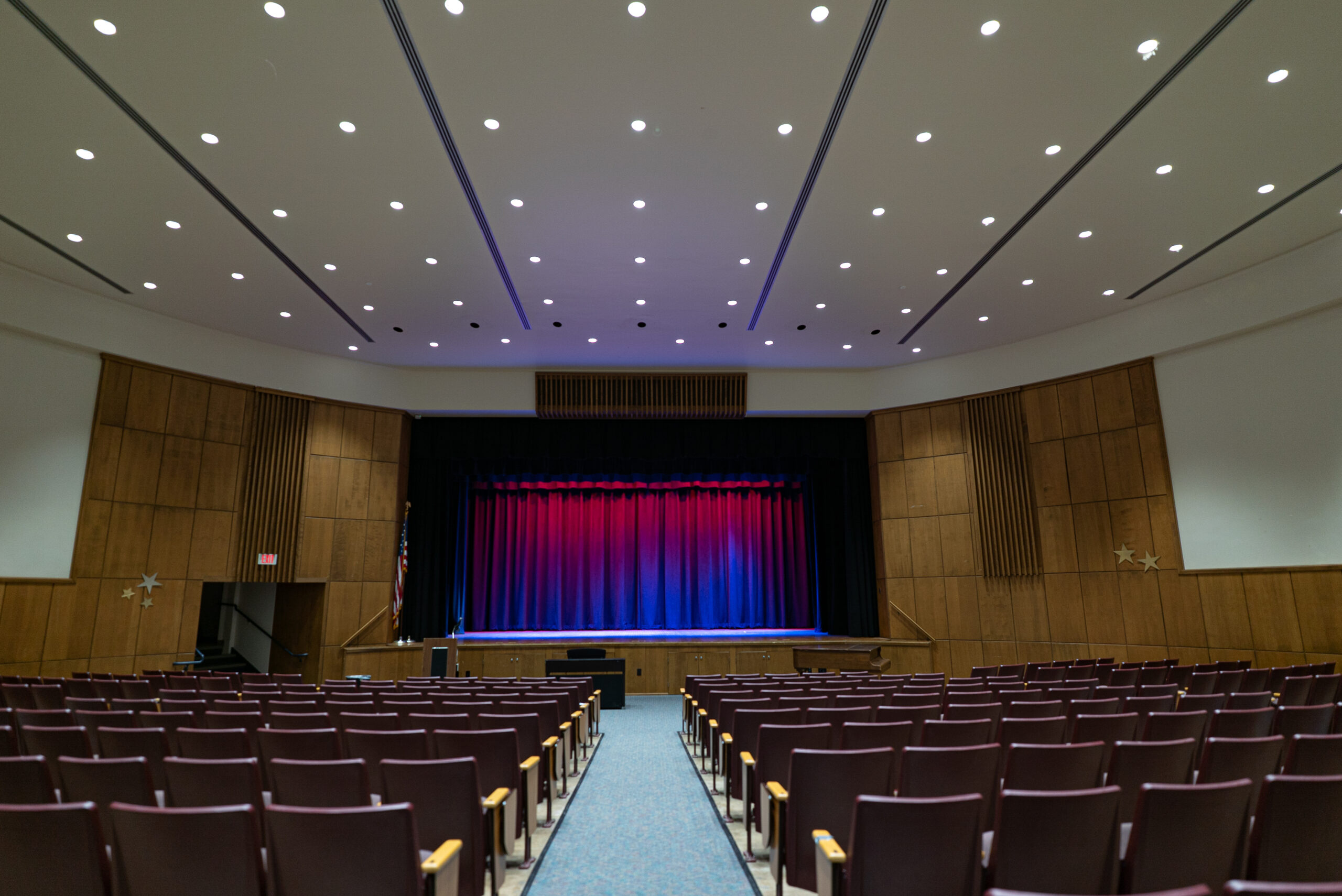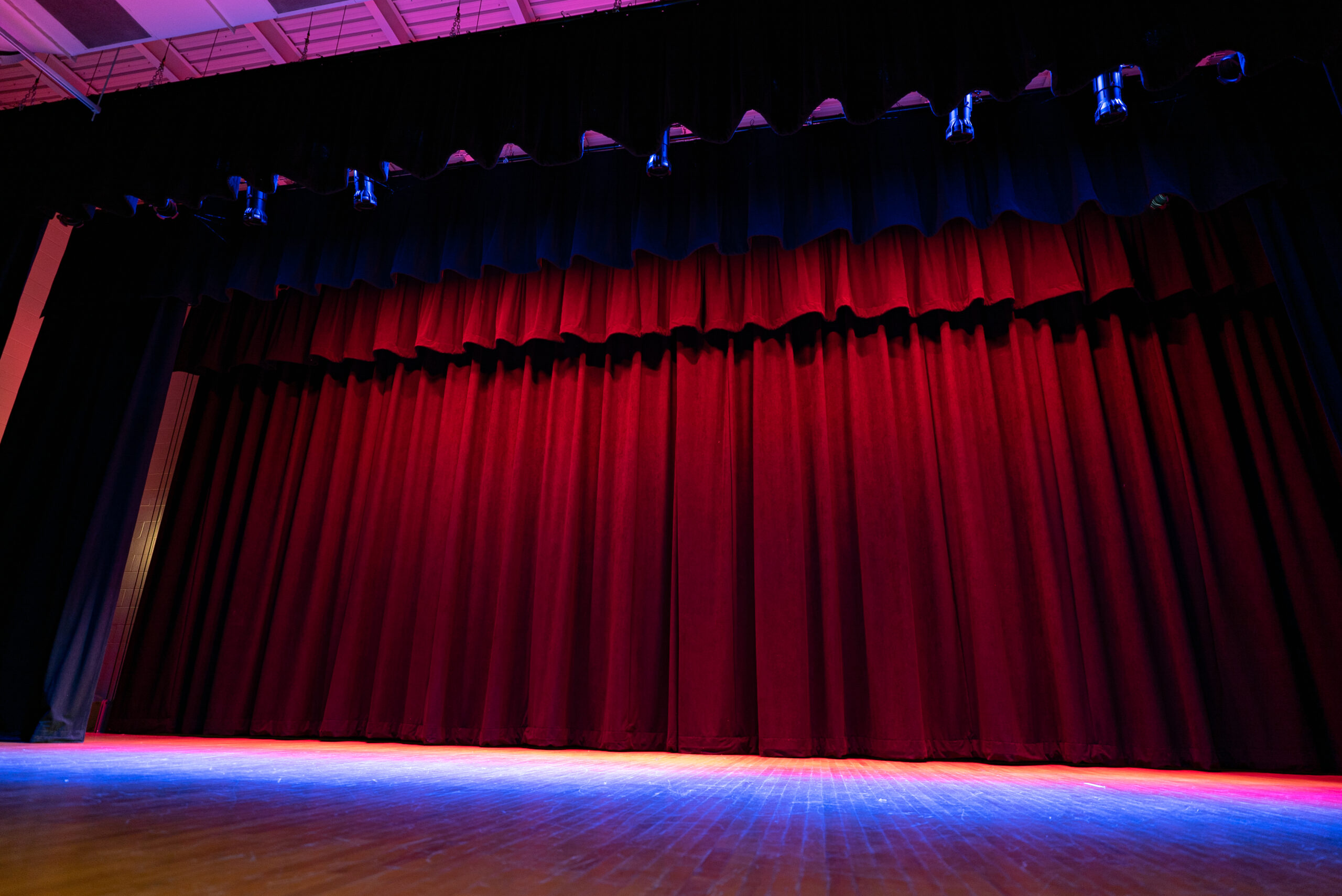 The upgrade included new white-only front lighting for clear visibility, color-changing top lighting to enhance performances, and an integrated control solution for the LED house lights that previously lacked proper dimming. The new dead-hung rigging system restored safety and reliability, and the fresh IFR velour curtains elevated both compliance and appearance. To make operation effortless, the system was built around simple, intuitive controls, including wireless house-light switches for areas where cable pathways did not exist. Every element of the design centered on creating a straightforward, dependable environment for student performances and school events.